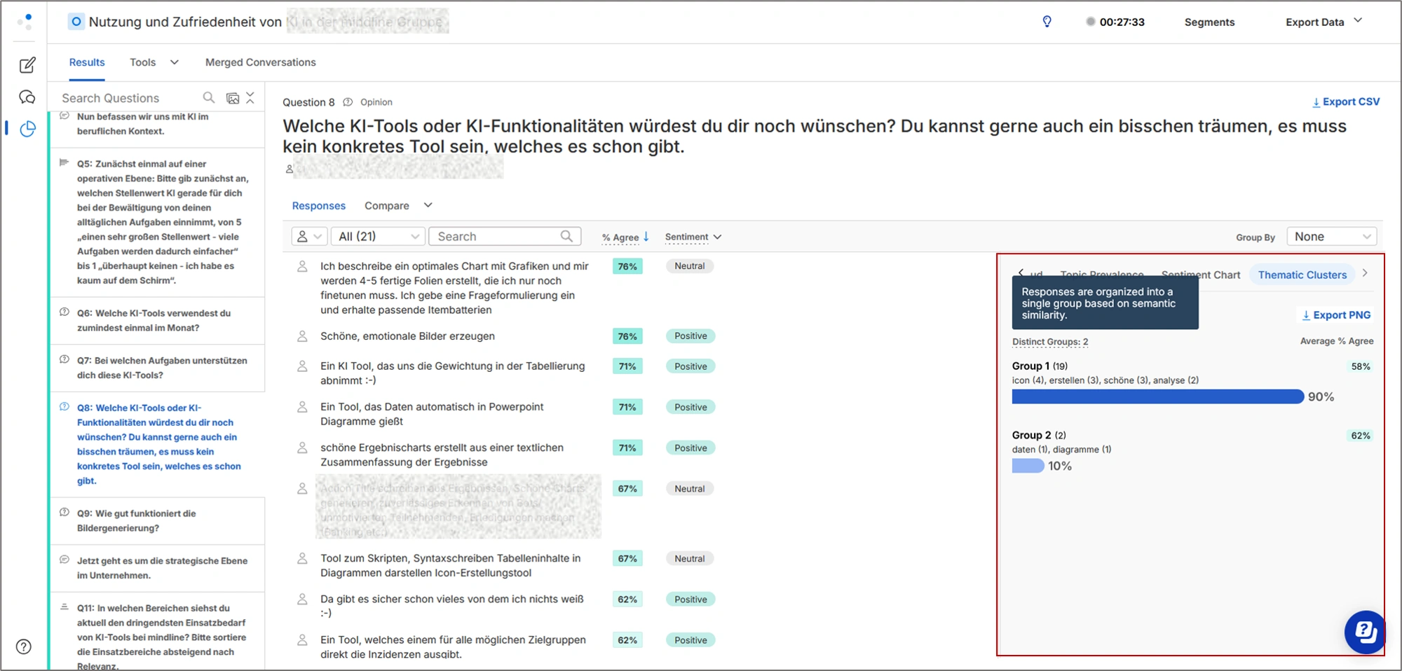 Remesh bietet keine klassische 1:1-AI-Moderation, sondern ermöglicht eine synchrone Befragung größerer Stichproben mit einem quantitativen Umfang von etwa 60 bis 1.000 Teilnehmenden (praktikabel nach unserer Erfahrung sind aber eher 50 bis max. 100).