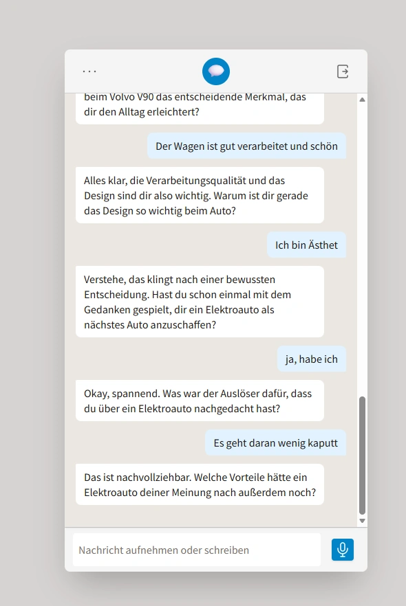Im Vergleich zu Remesh liegt der Fokus hier stärker auf der individuellen Argumentations- und Motivstruktur einzelner Befragter. Die Interaktion bleibt jedoch text- bzw. sprachbasiert und ist zeitlich begrenzt.